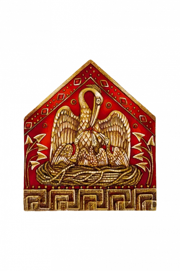 Пеликан символизирует Христа в таинстве евхаристии: «Иисус, взяв хлеб и благодарив, преломил и подал им, говоря: сие есть тело Мое, которое за вас предается…» (Лк.22:19)